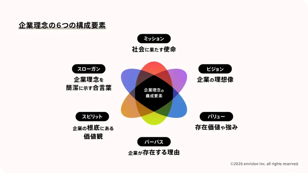企業理念はいくつかの要素から構成されており、それぞれに異なる役割と意味があります。理念をより深く理解し、組織全体に浸透させるためには、以下の6つの要素を意識して設計することが重要です。