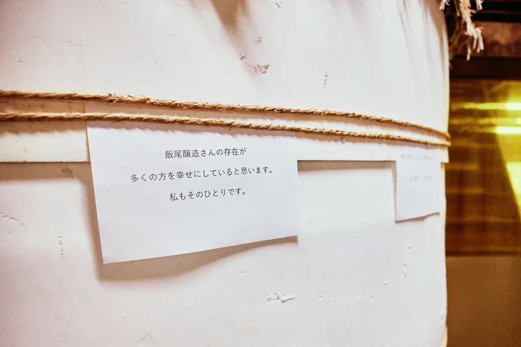 先ほど蔵をご案内いただいた時、醸造樽にお客様からのメッセージが何枚も貼られているのを見ましたが、あれはどういった狙いなのでしょうか?